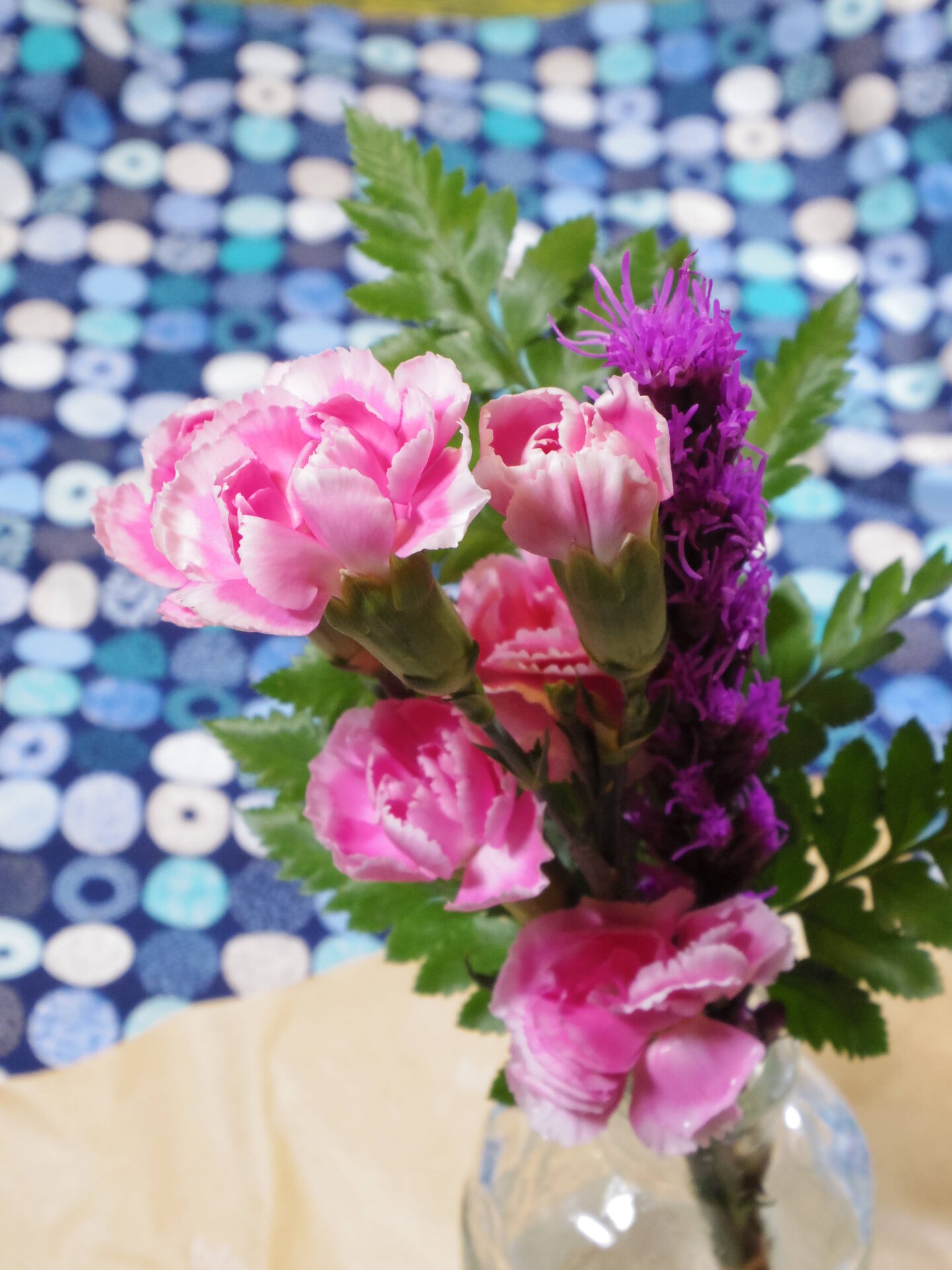 お花屋さんで買うとカーネーションだけということもあるでしょうけれど、グリーンの緑があって小さくってたくさん花のあるカスミソウの3つが揃うと賑やかな感じになります。