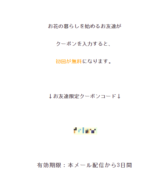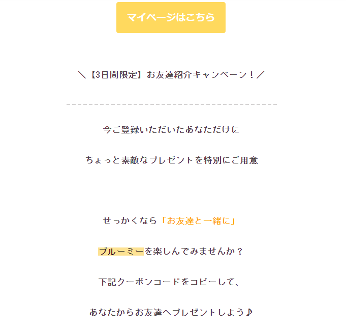 自分用のクーポンではなくって、知り合いにブルーミーを紹介して契約する際にそのコードを使用すると紹介された人の初回分が無料になるサービスでした。