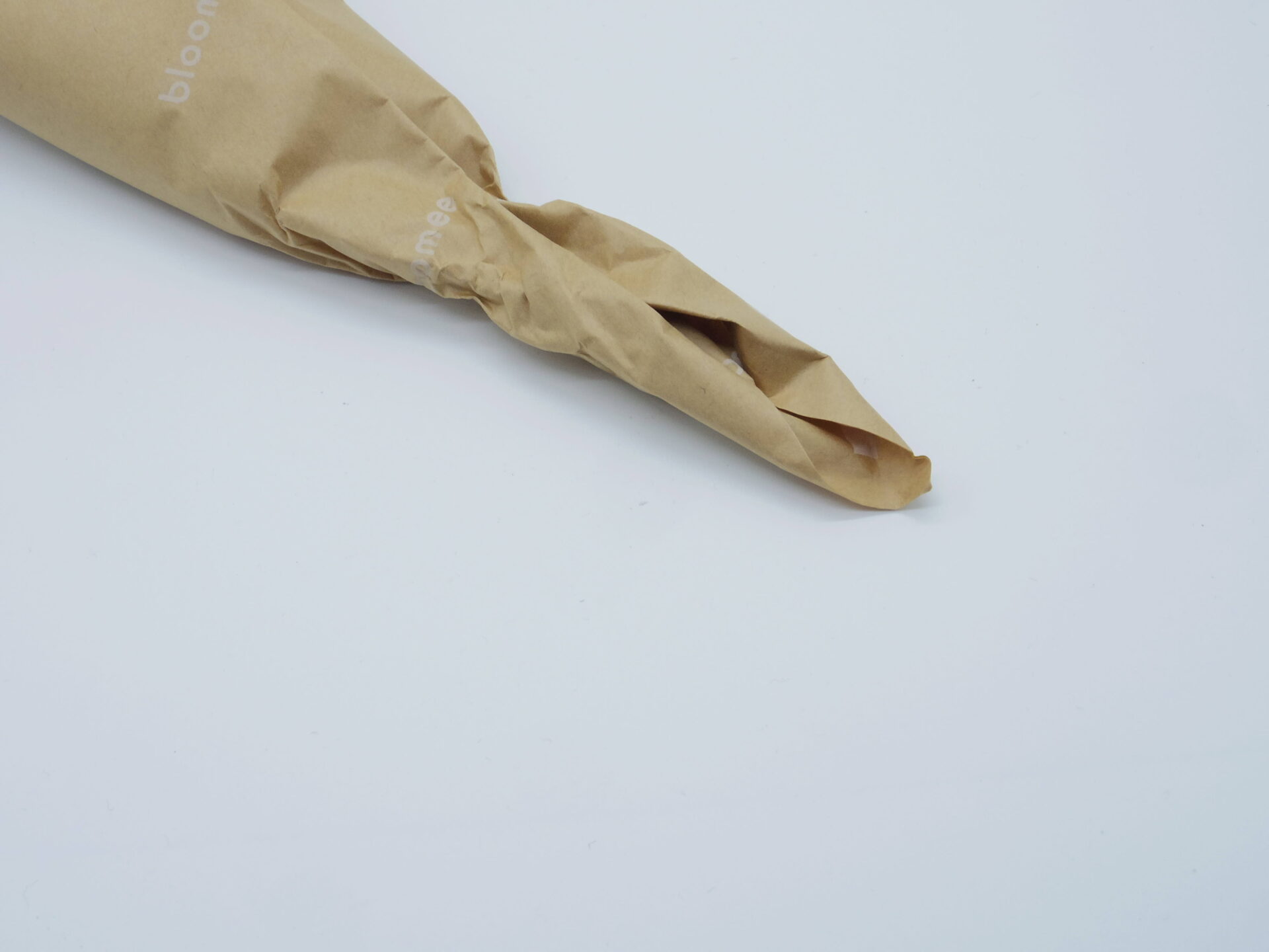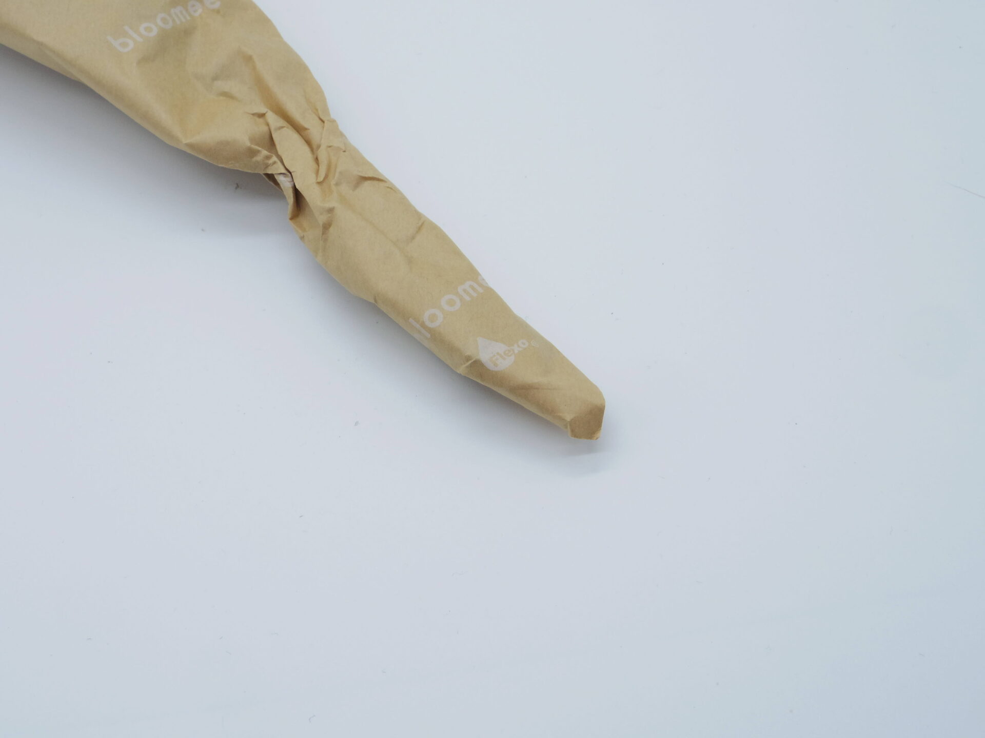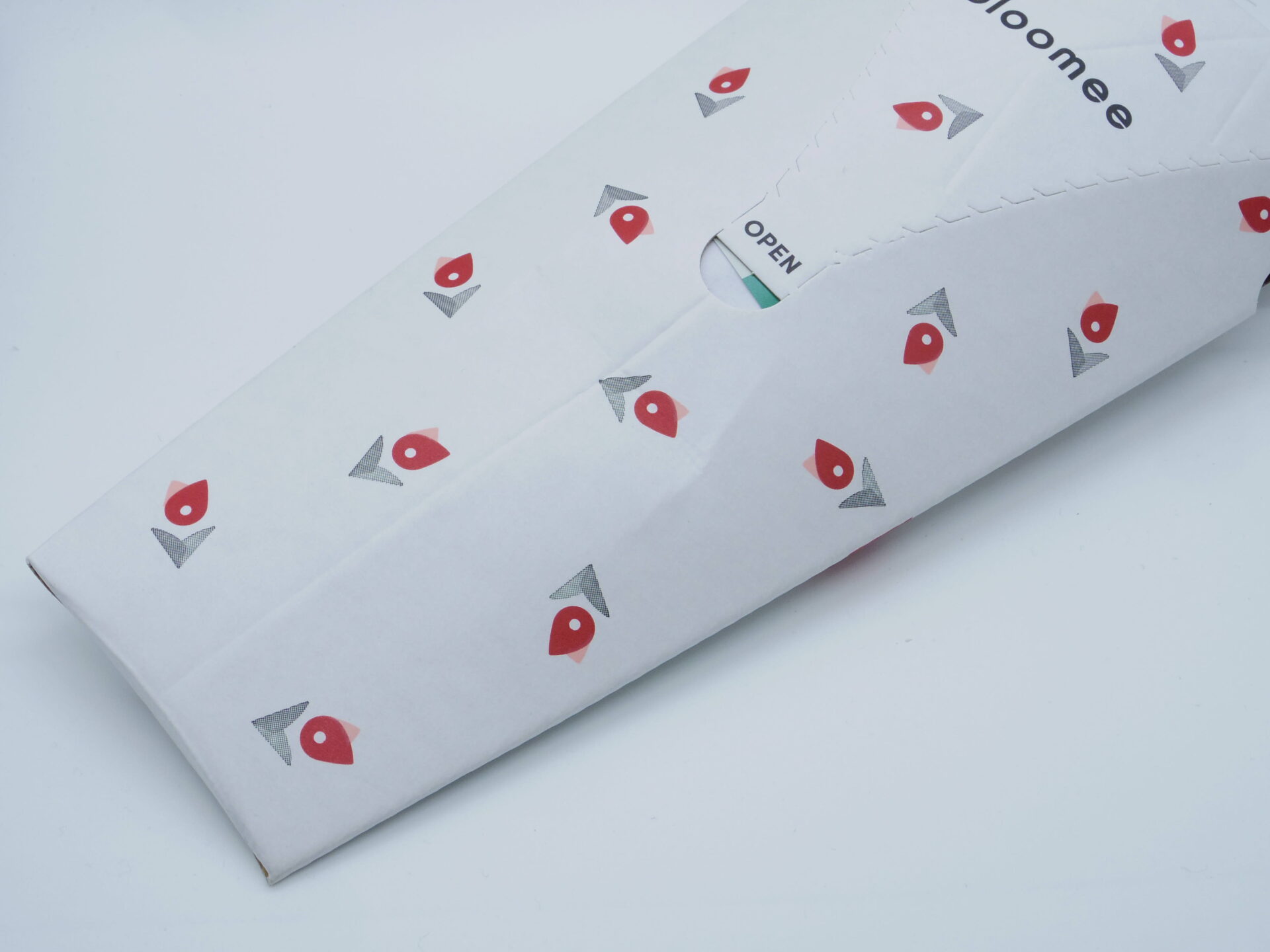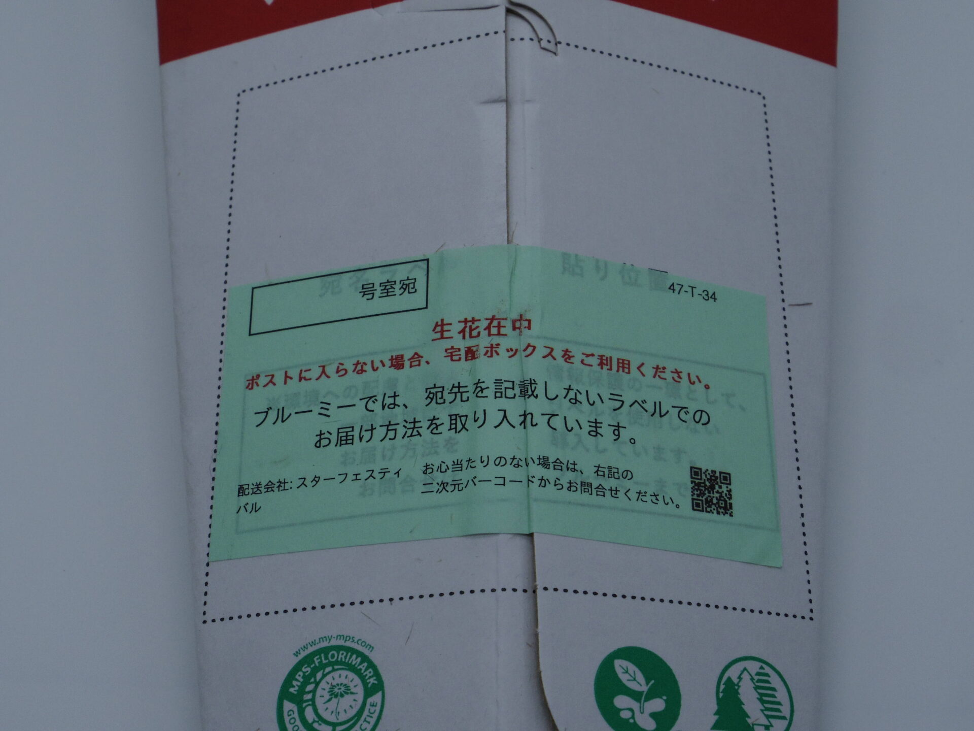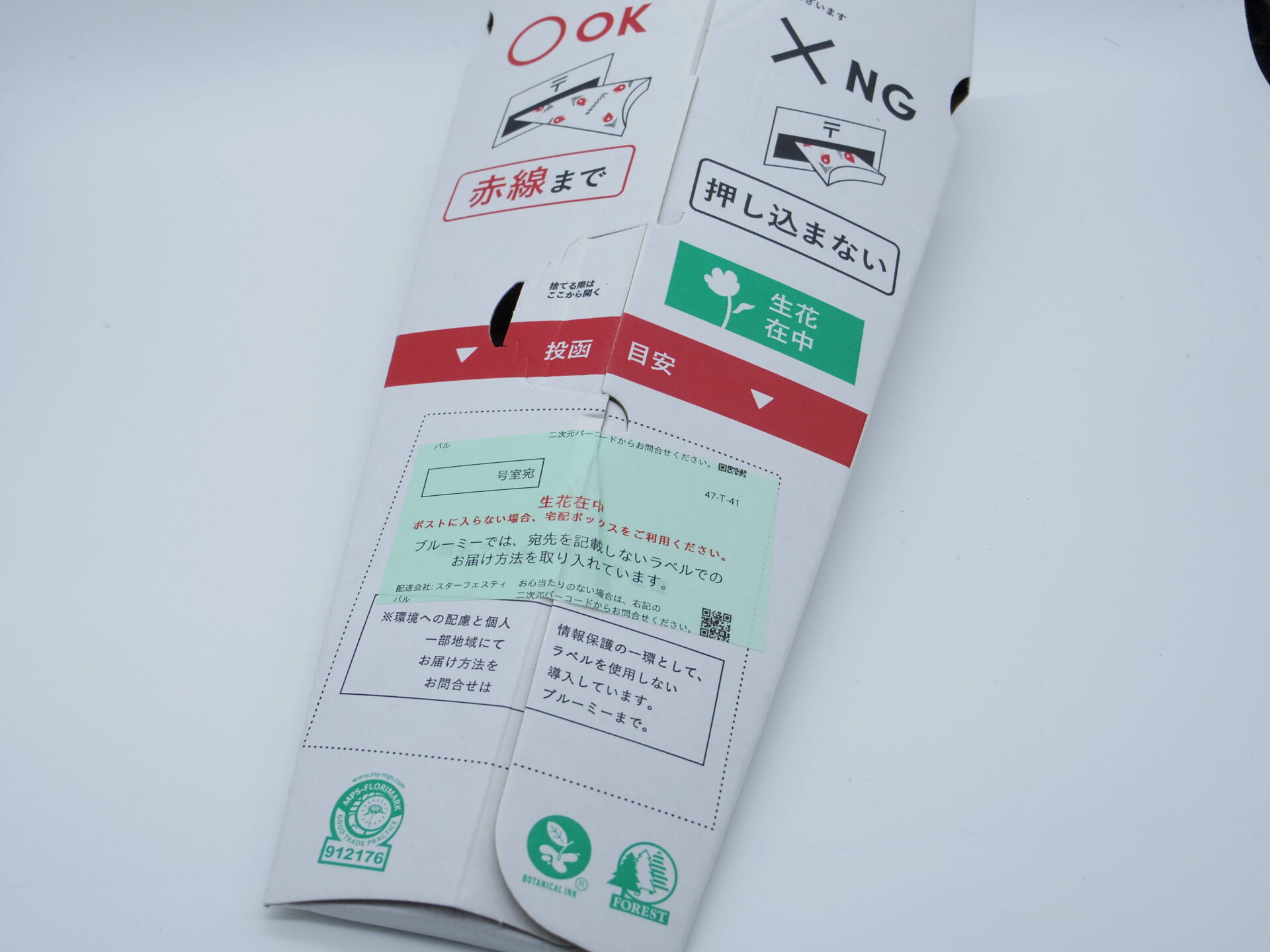 ブルーミーのパッケージの裏です。宛名なしで配送している花のサブスクはブルーミー以外ありません。環境にやさしいのです。