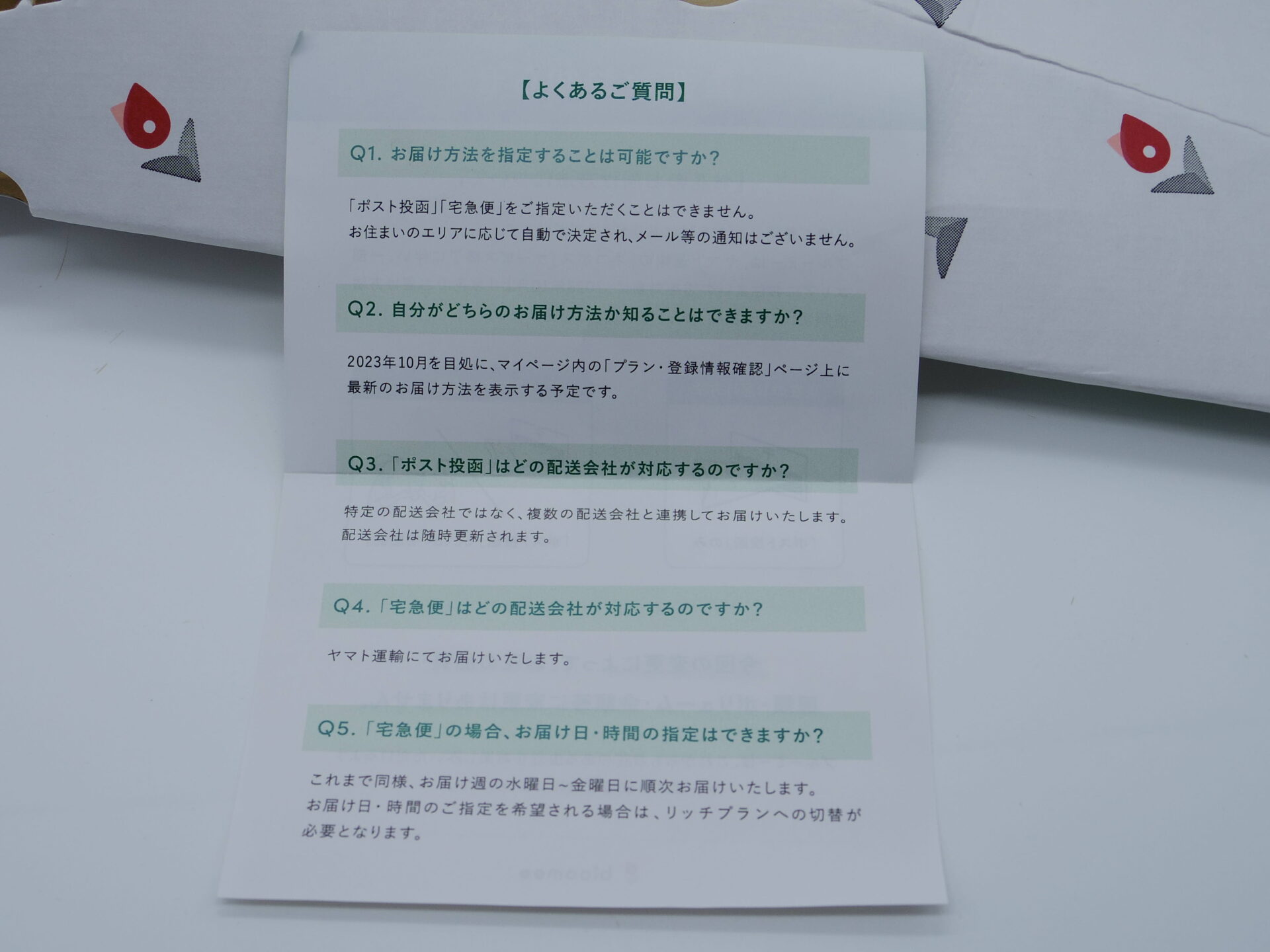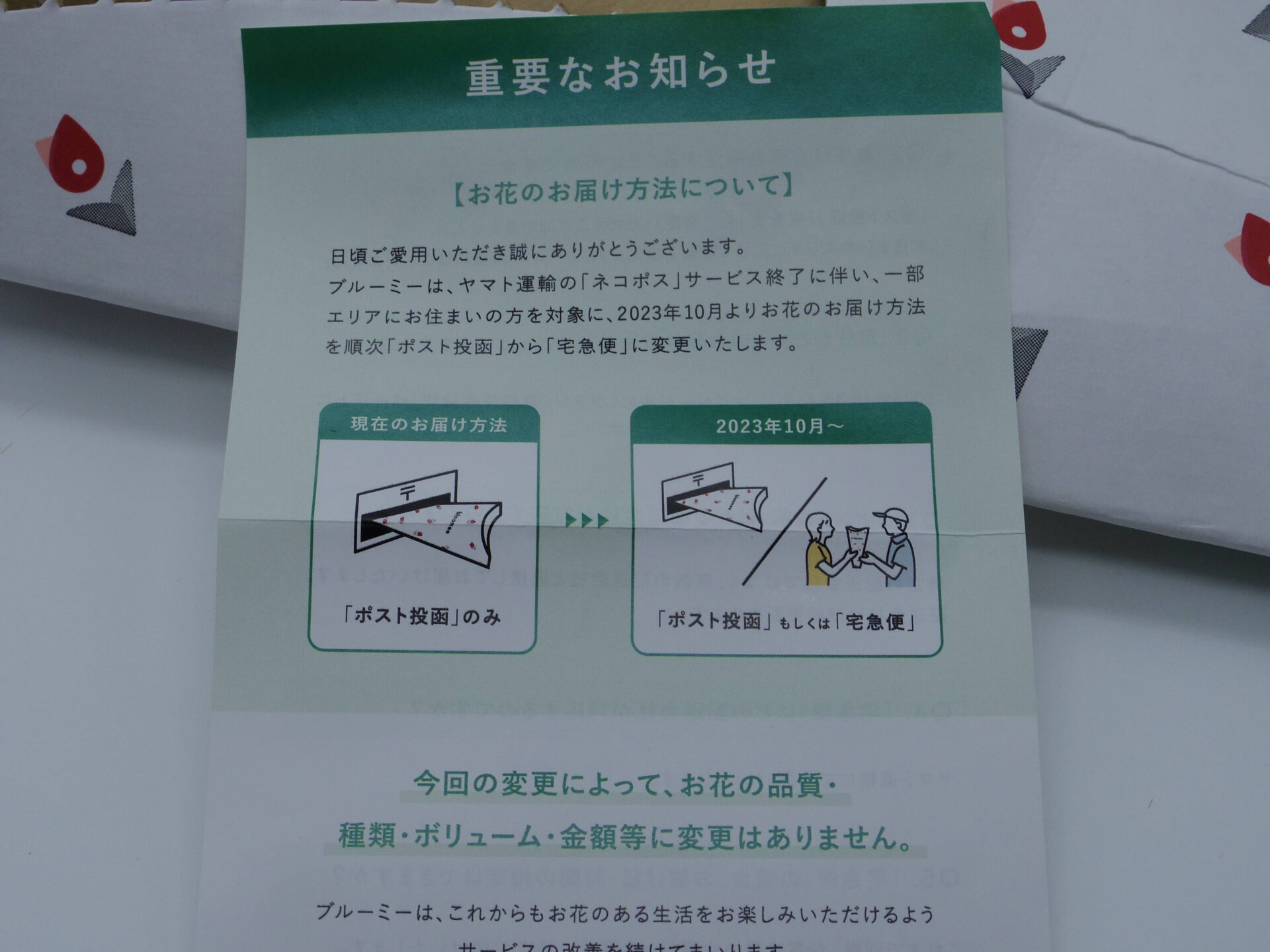 ブルーミーのメール内容が2023年8月から変っています。宛先ラベルがない状態でポストに投函されていました。2023年10月からのブルーミー体験プランは「ポスト投函」から「宅配便」に順次変更されます。