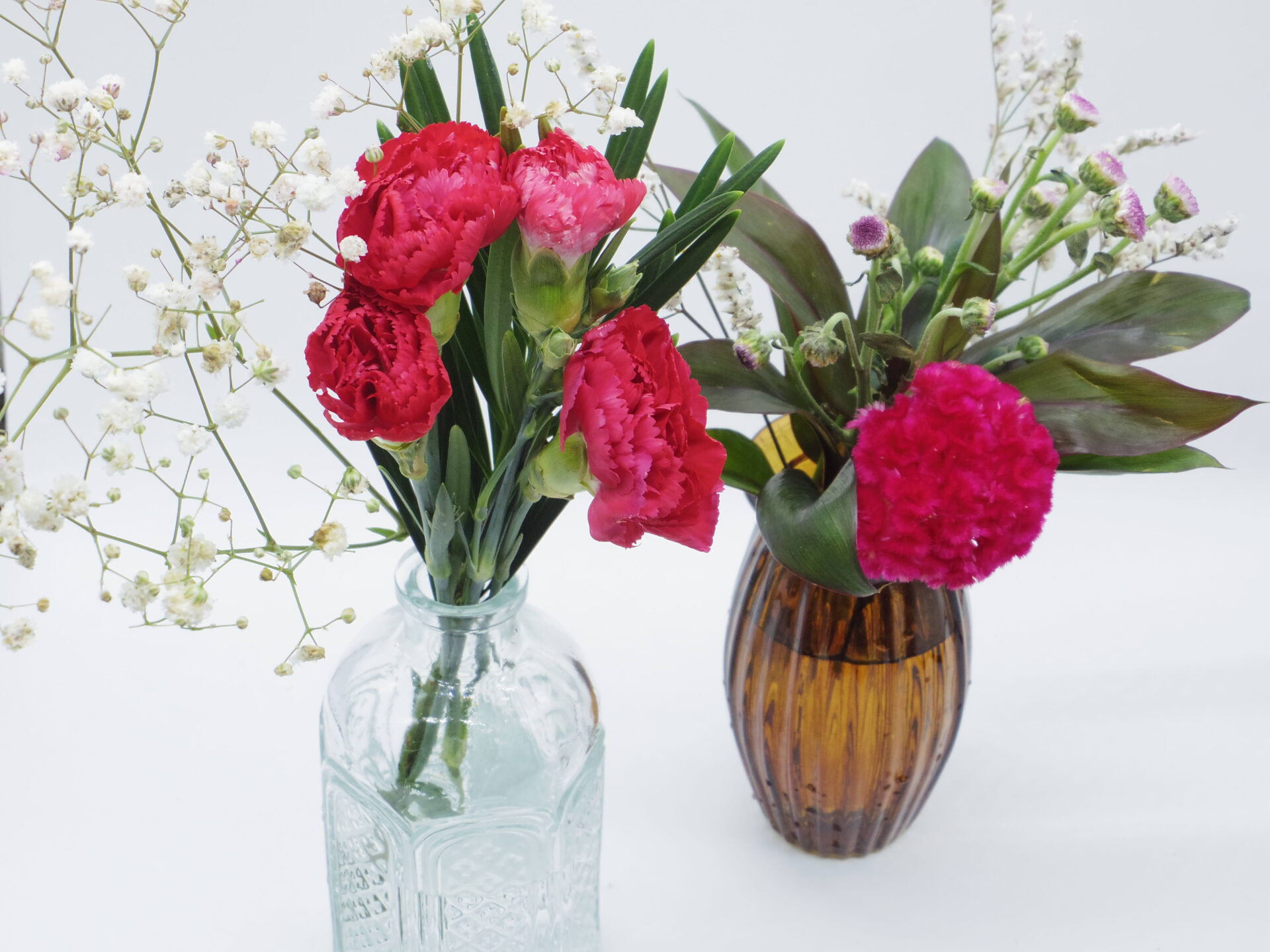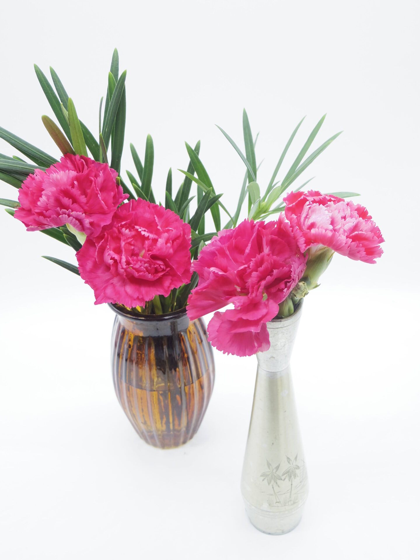 1週間前に届いたカーネーションが枯れずに咲いています。左の花瓶は比較的元気なので室内に。右側の花瓶は3軍ということで洗面所に飾っています。いかがでしょうか?