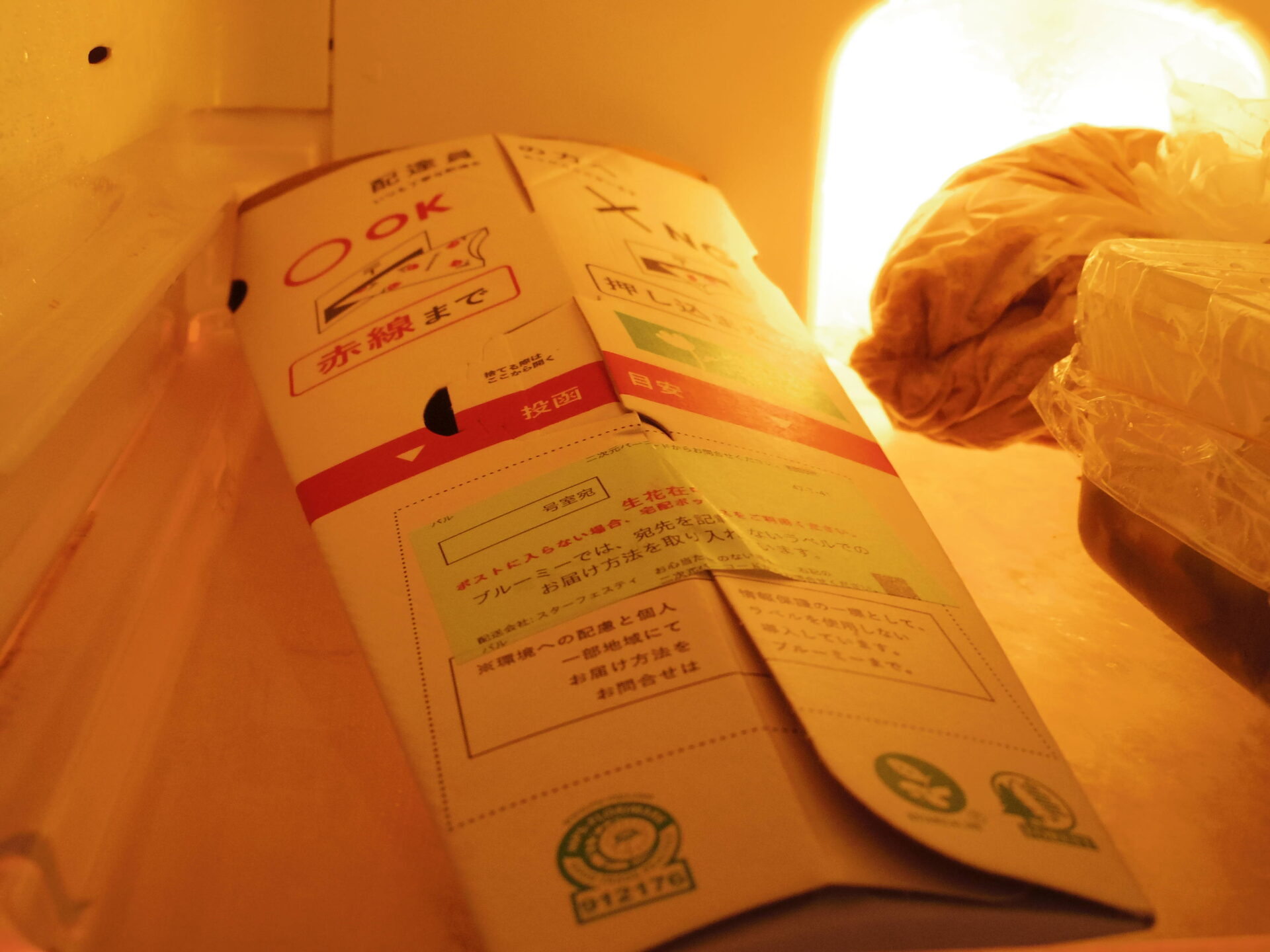 2023年9月14日に自宅ポストに届いたブルーミー君を自宅の家庭用冷蔵庫で冷蔵保存。
