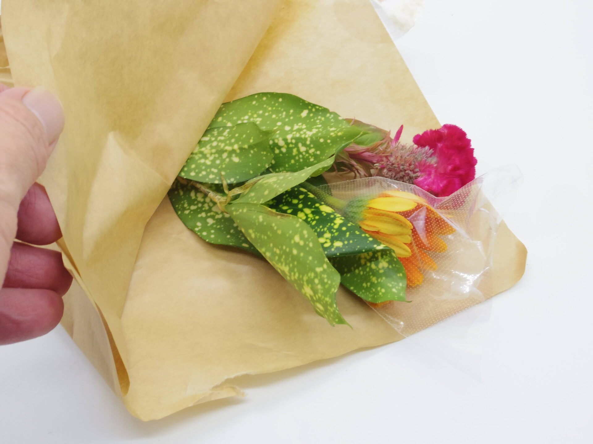 9/17の9時に冷蔵庫から取り出した体験プランのブーケは葉の端っこに枯れが少しありました。