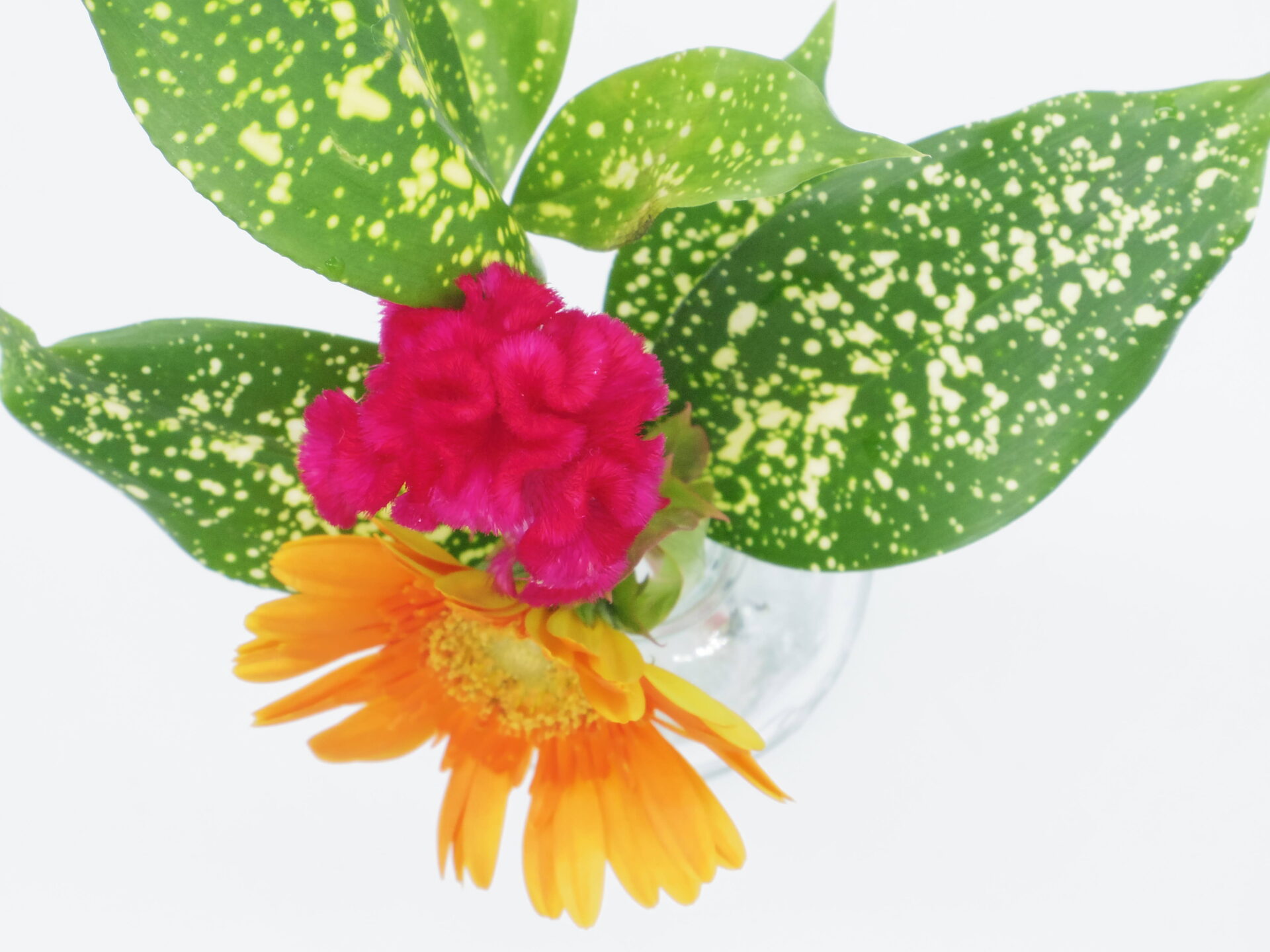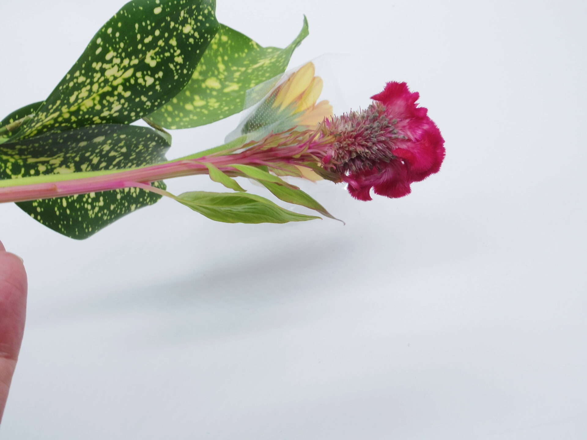 深紅のケイトウは小さめで花が透けている部分があり決して100点とは言いがない。オレンジ色のガーベラーとグリーンのゴットセアラム。値ごろ感は送料なしでの”550円相当”かな? という感じです。