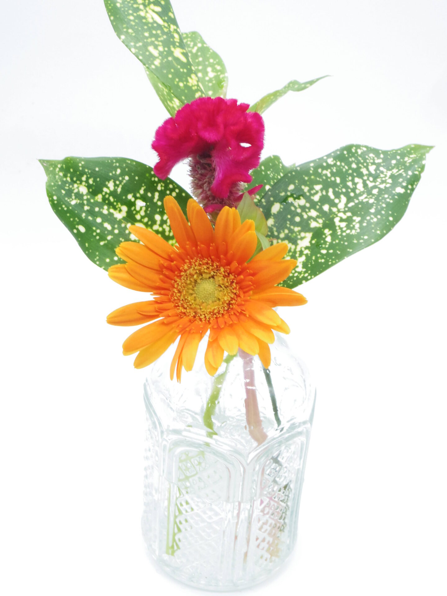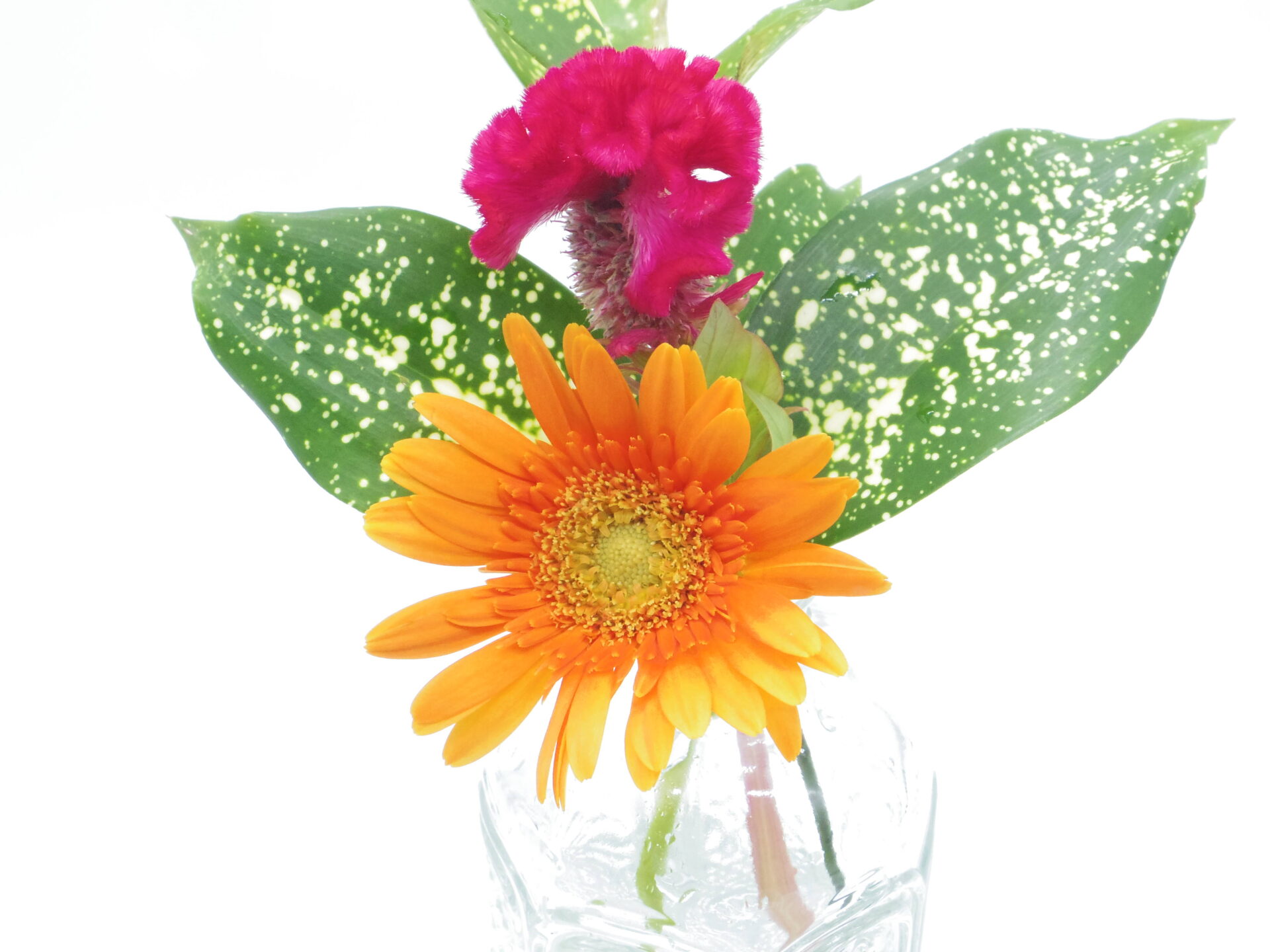 花瓶は百均で購入しています。岐阜あるいは静岡産のガーベラと愛知産のケイトウ。そしてシンガポール産のゴットセアラム。